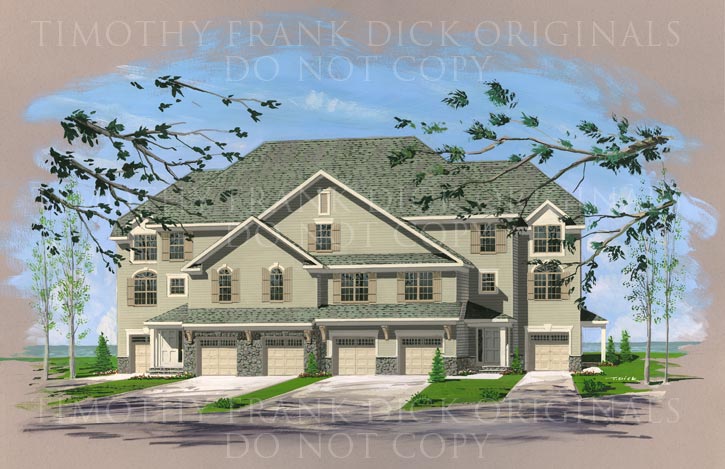Timothy works with Gouache, a high quality, opaque water color. Windsor Newton Gouache gives your rendering or house portrait a brush less, smooth, radiant, new-like appearance. The renderings are painted on illustration board and mounted on foam core. The original is sent to you for your presentation / marketing purposes.