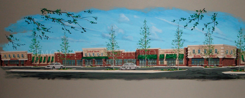 In the example below, a photo of the existing building is enlarged to a 30” x 24” format. What the new building will look like is painted right on the photo. The authenticity of the site stays intact. The utility lines, poles and snow are taken out creating a clean fair weather scene.